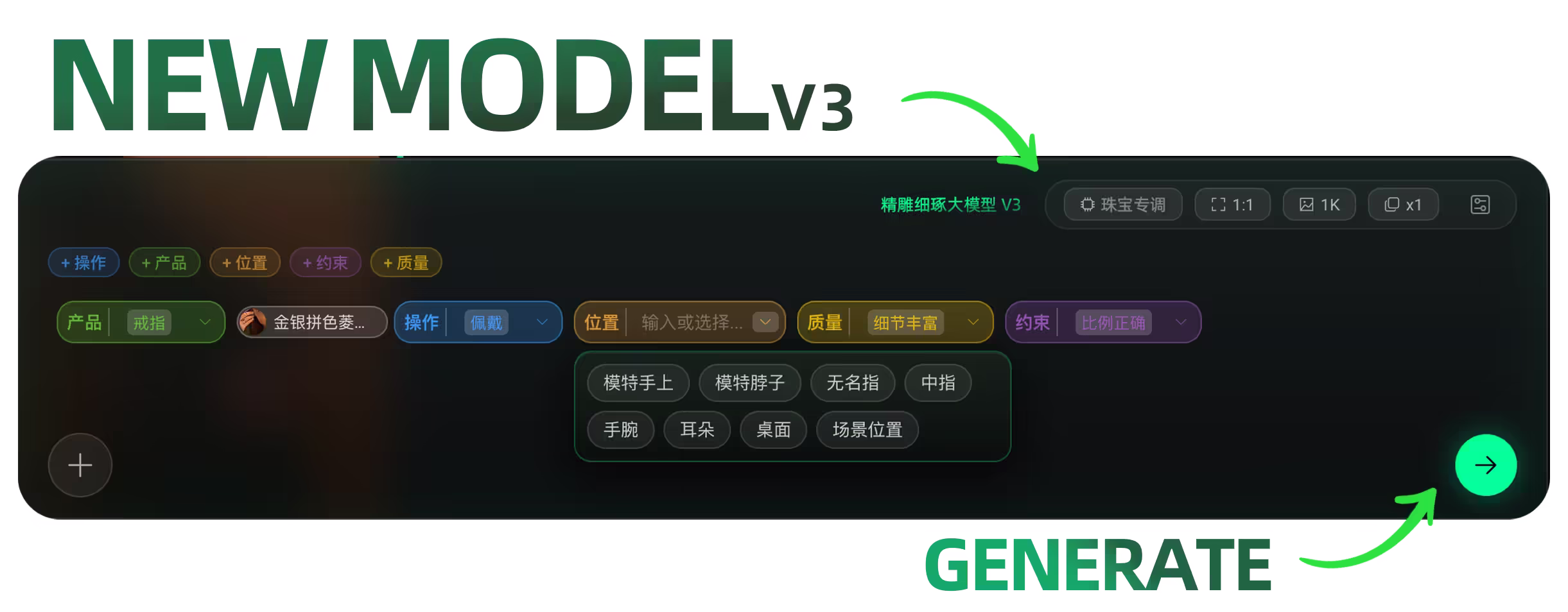 “做一张好看的素材”,“戴在模特身上/放在场景里”,为了让AI更好的处理极其小而精致的产品,我们打造了两款专业工具.